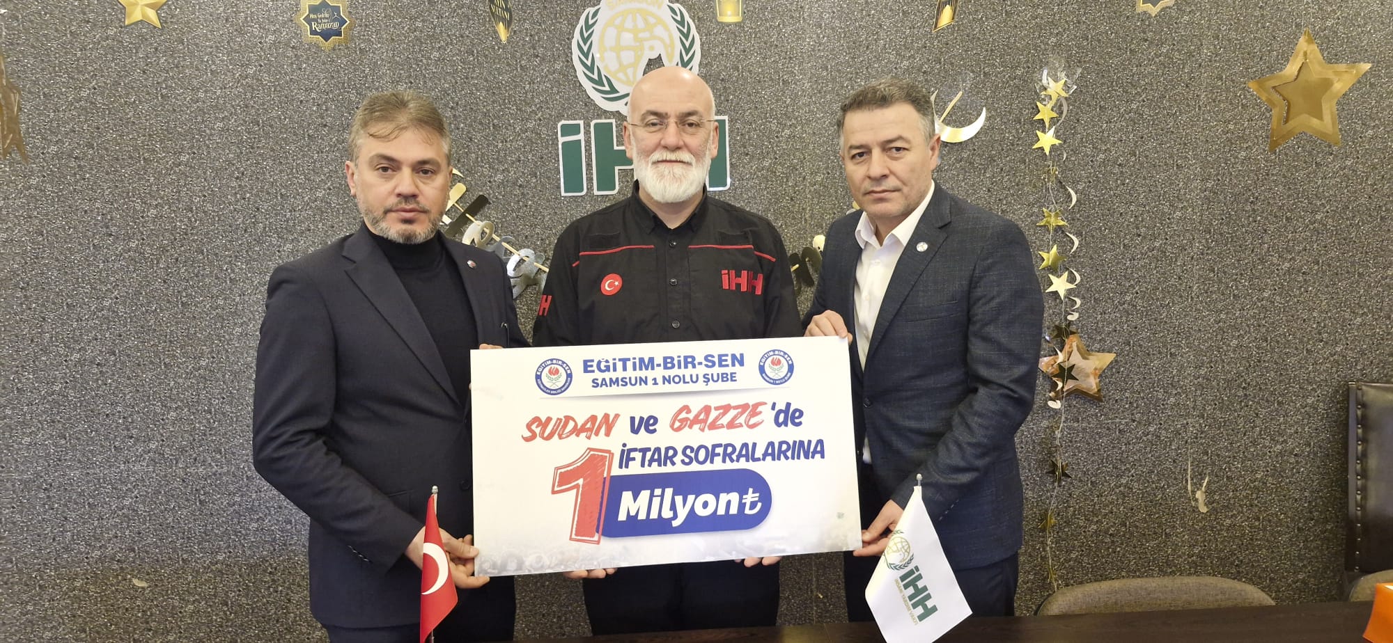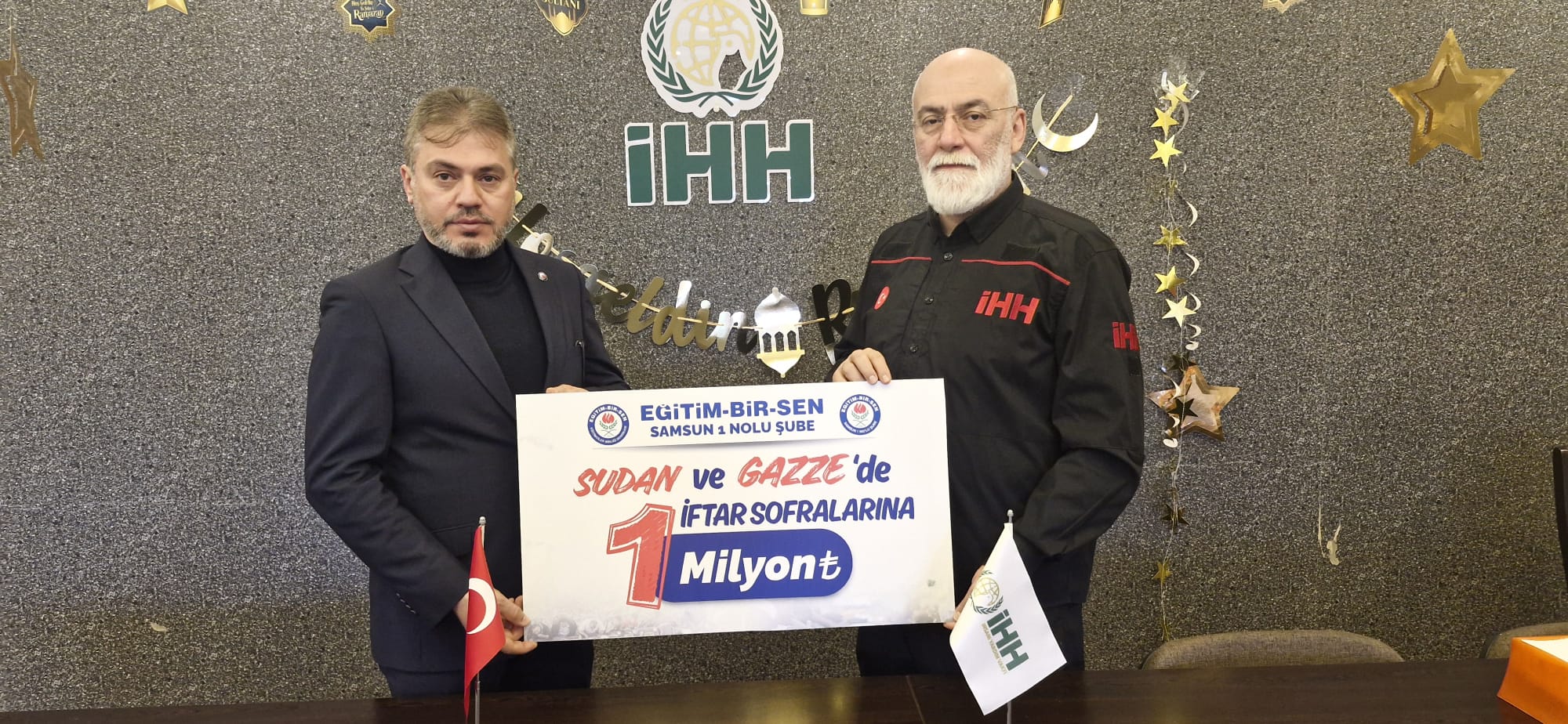 Eğitim Bir-Sen Samsun 1 Nolu Şube, İsrail zulmü altında zor günler geçiren Gazze ve iç karışıklıklarla mücadele eden Sudan’daki kardeşlerini unutmadı. Sendika üyelerinin destekleriyle toplanan 1 Milyon TL’lik bağış çeki bölgedeki iftar sofralarına ulaştırılmak üzere Eğitim Bir-Sen Samsun 1 Nolu Şube Başkanı ve Memursen İl Temsilcisi Hamdi YILDIZ ve Şube Başkan Yrd. Vedat GÖKMEN tarafından İHH Samsun Başkanı Mustafa YEŞİL'e teslim edildi.