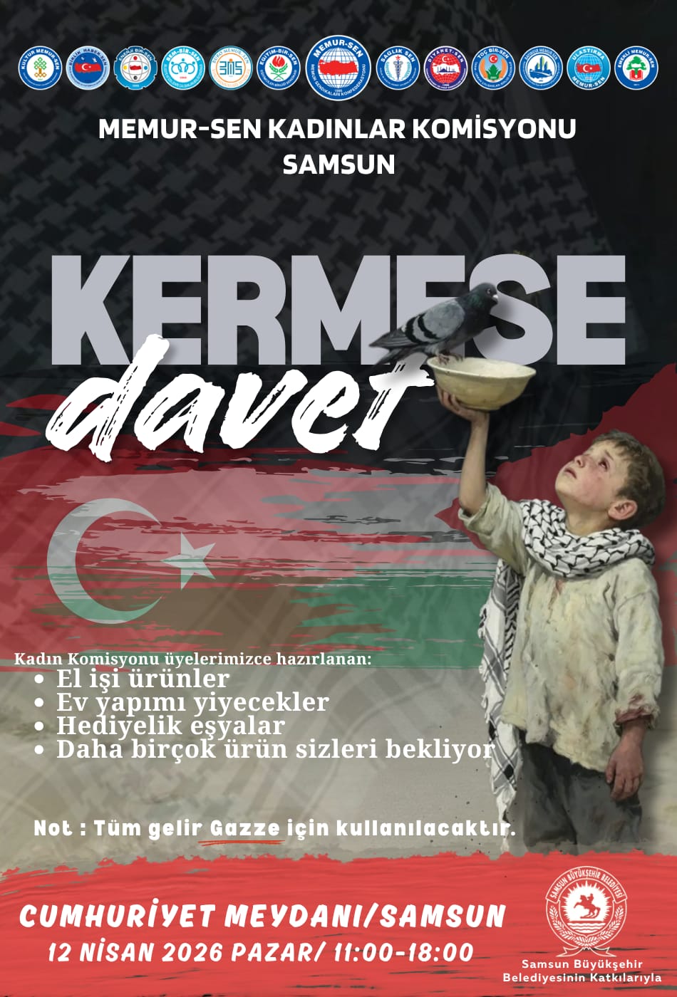 Sumut filosunun kalkış yaptığı 12 Nisan'da bizler de memursen kadın komisyonlarımızın Cumhuriyet meydanı'nda hazırladığı kermesle yardım kampanyamızın başlangıcını yapıyoruz inşallah. Bütün halkımızı destek için 12 Nisan'da Cumhuriyet meydanına bekliyoruz. Kermesimiz saat 11:00-18:00 arasında açık olacaktır.